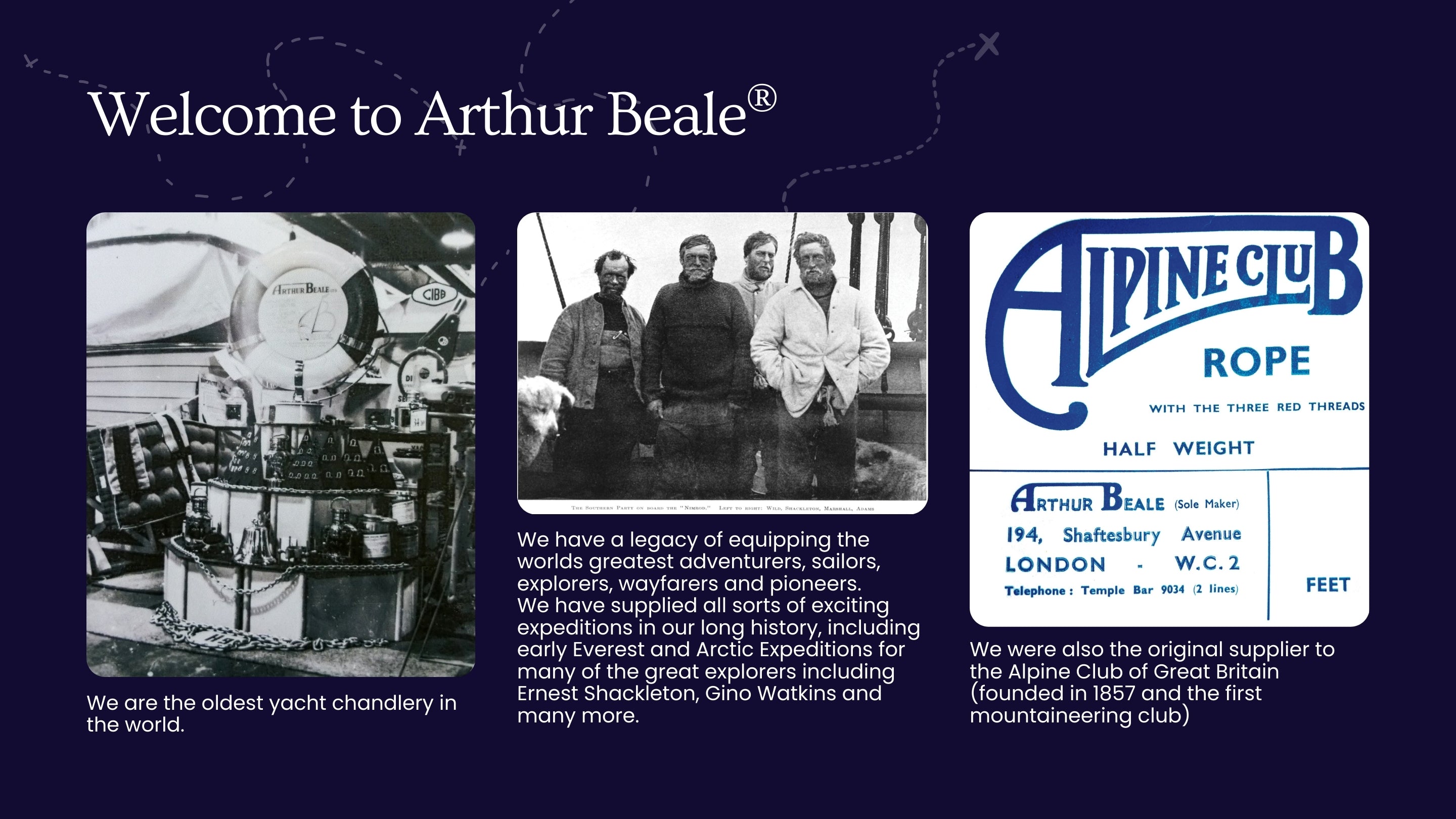 Arthur Beale are one of the United Kingdoms oldest chandlers, tracing our history back 500 years. We have supplied all sorts of exciting expeditions in our long history, including early Everest and Arctic Expeditions for Ernest Shackleton, Gino Watkins and many more.